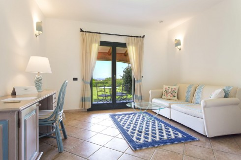 - Junior Suite SV, площадью 35 кв.м., макс. размещение 4 чел., идеальное решение для семей. Номера включают в себя спальню и отдельную гостиную с диваном. Просторная меблированная веранда c восхитительным видом на море Коста-Смеральды. Все номера отличаются друг от друга, но при этом каждый из них располагает кондиционером, подключением Wi-Fi, телевизором со спутниковым телевидением, телефоном, сейфом, минибаром, кофеваркой и чайником (по запросу). В ванной комнате имеется душ, а также фен, набор туалетных принадлежностей, халаты и тапочки. В стоимость проживания в отеле входит посещение оздоровительного центра (но не сами процедуры), а также пляжные полотенца